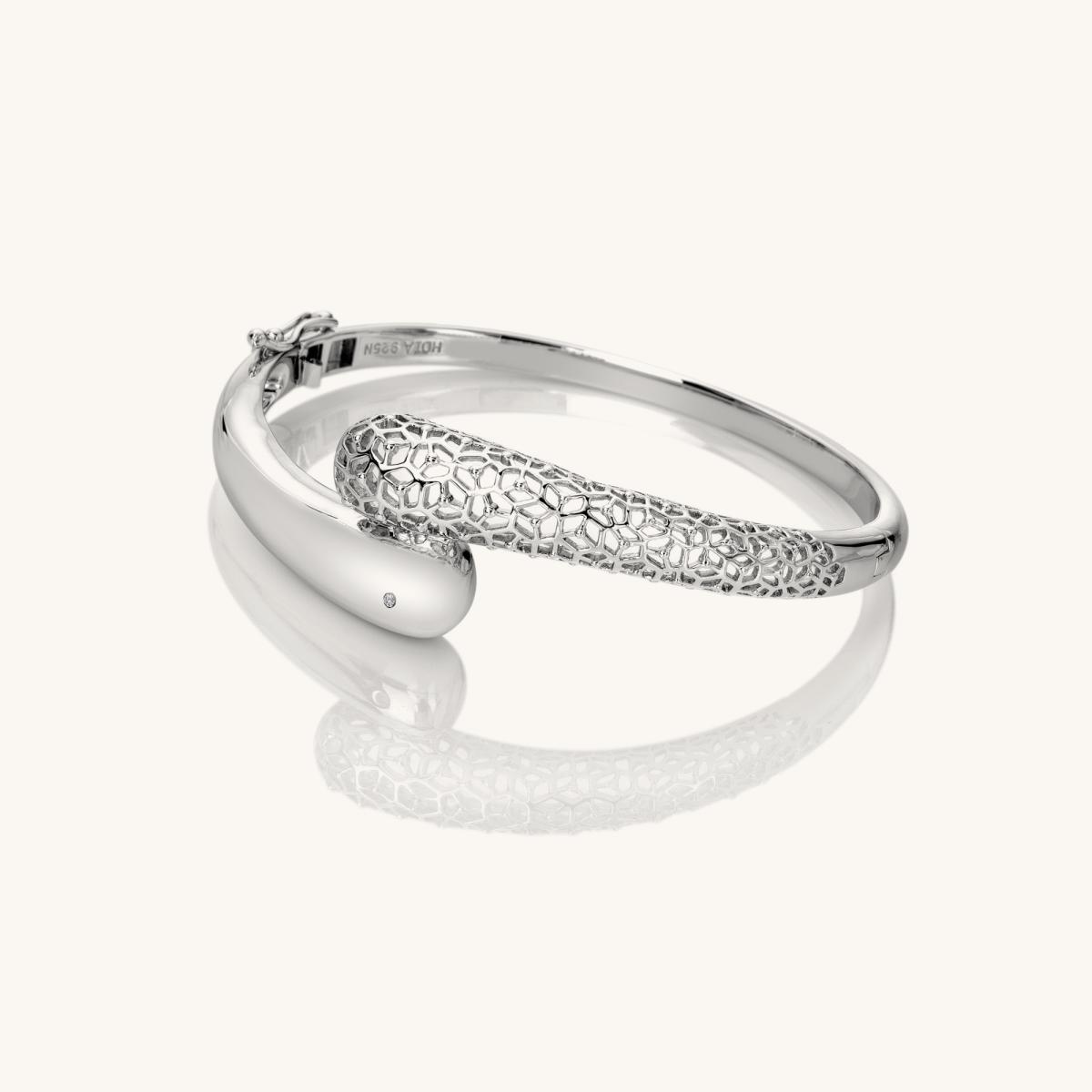 Make a bold statement with Aster, embellished with an openwork design contrasted with sleek silver. Crafted in sterling silver and hand-set with a real diamond, this bangle measures 65mm wide.