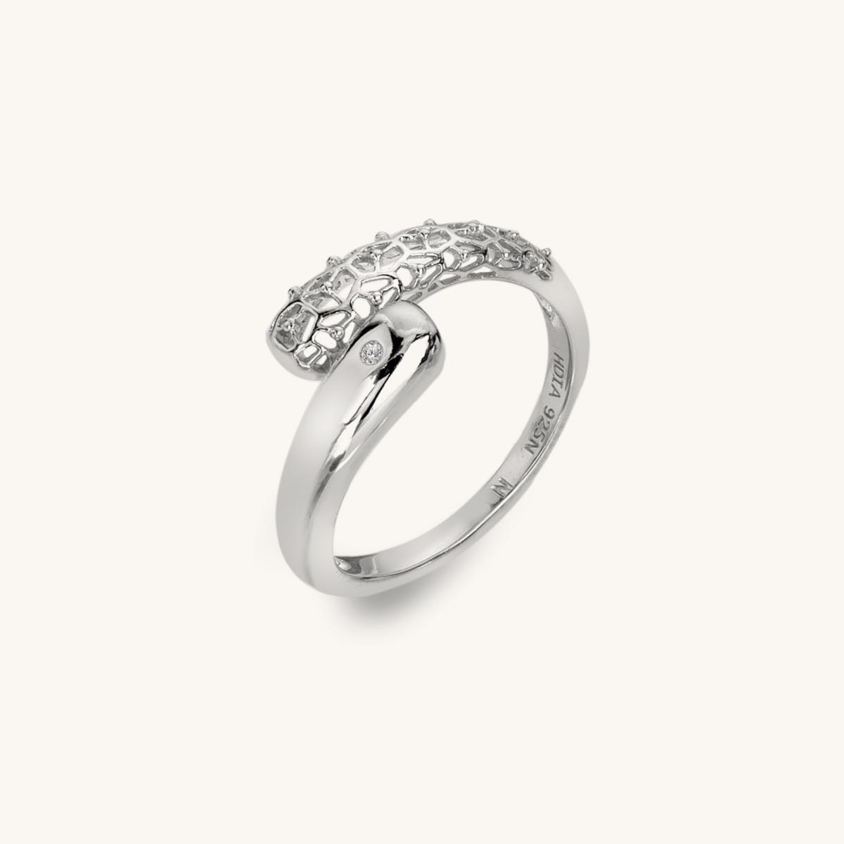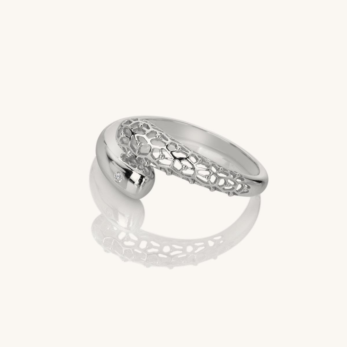 Make a bold statement with Aster, embellished with an openwork design contrasted with sleek silver. Crafted in sterling silver and hand-set with a real diamond, this ring measures 10mm at it's widest point.