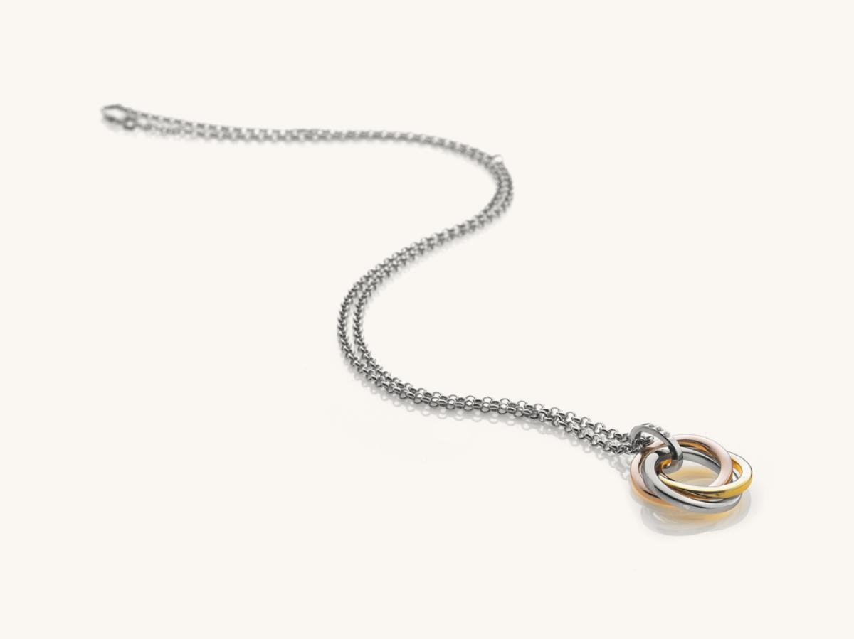 From our Trio Collection: For then, for now, forever. Rose and yellow gold highlights attune perfectly with sterling silver and diamonds to deliver a truly exquisite suite. This stunning necklace features a blend of precious metal interlocking hoops that are gathered with a silver band adorned with three one point diamonds. Pendant measuring 17mm x 24mm.