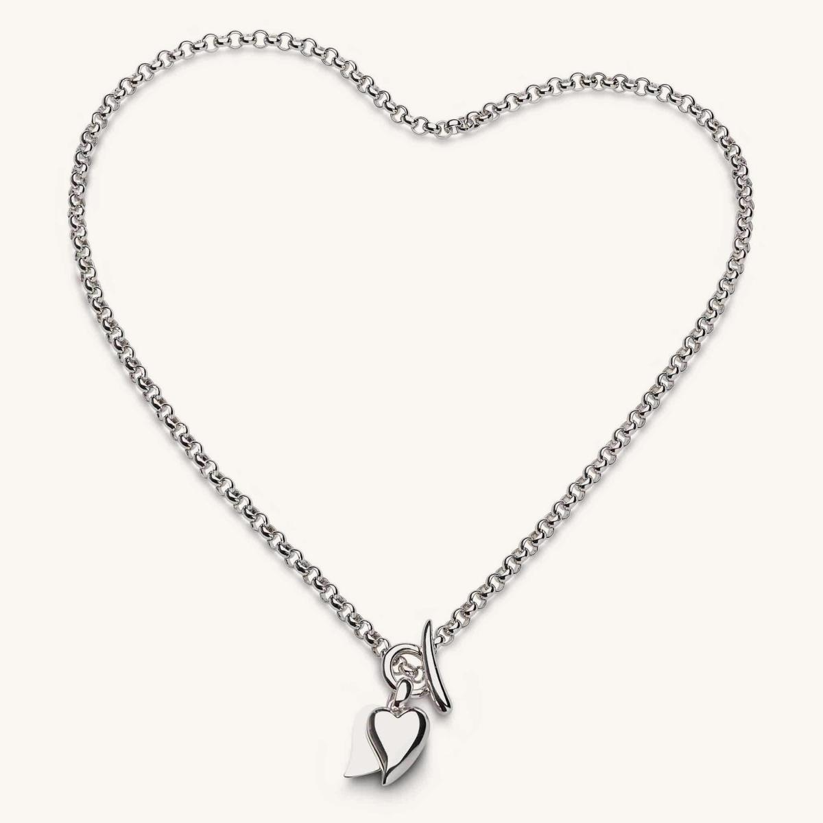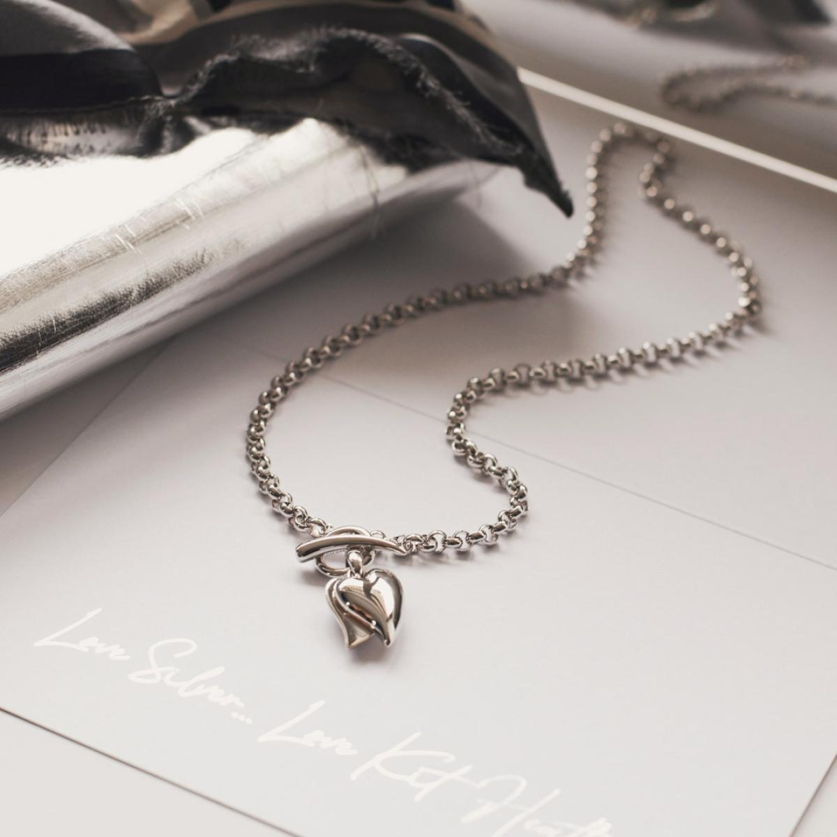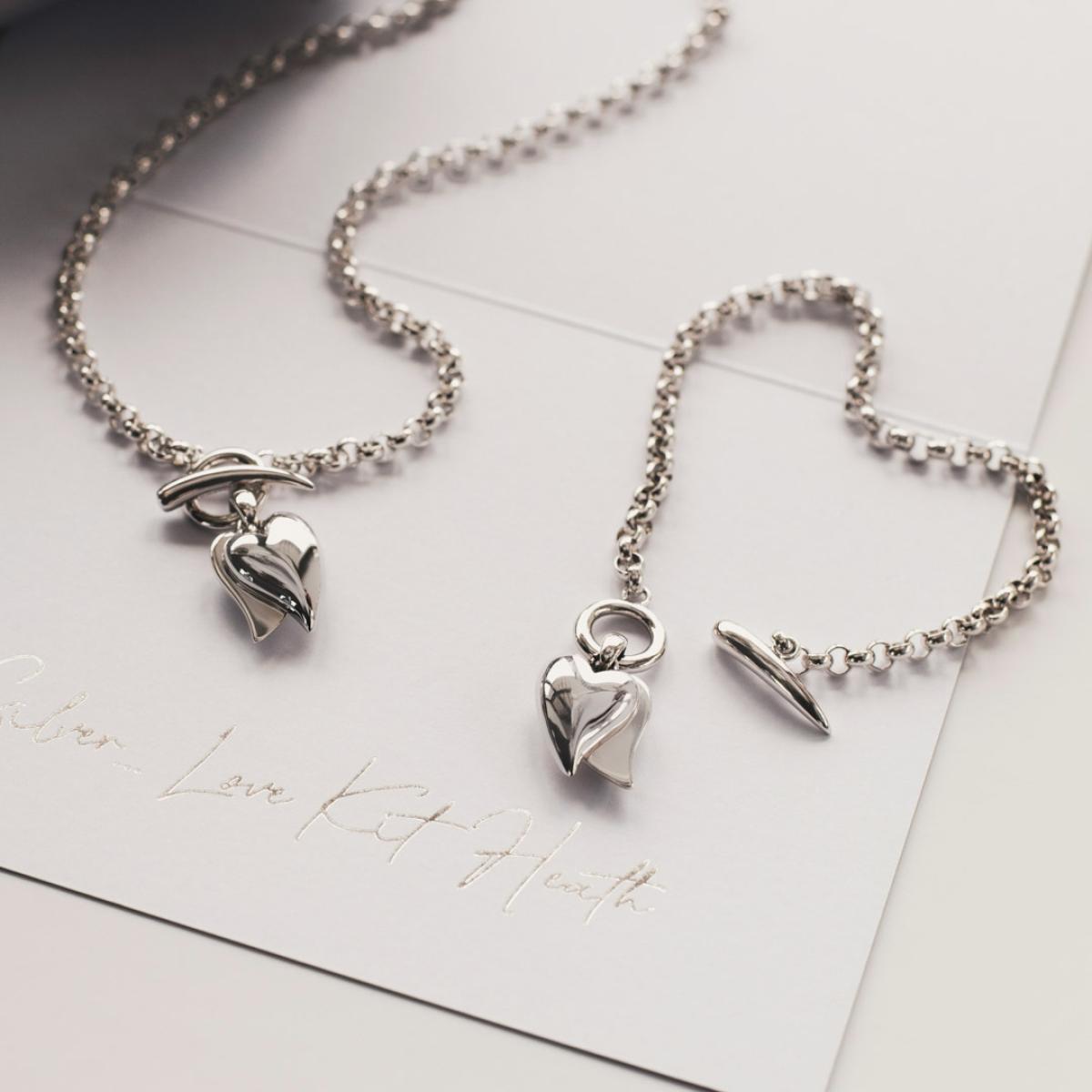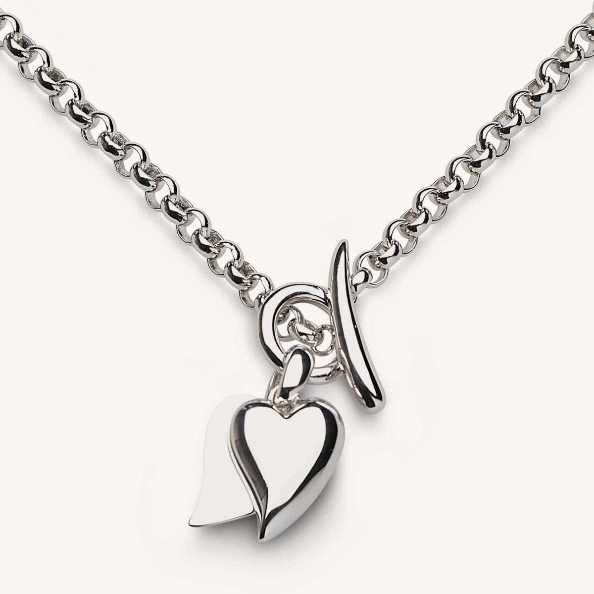 This rhodium plated sterling silver T-bar necklace features two interlocking hearts that meet and touch by design. As the inner surfaces connect, they naturally develop a unique patina over time, reflecting the wearer's journey. The toggle fastening offers both security and modern ease. Hallmarked for quality, this piece carries personal sentiment with refined simplicity. A statement design with enduring character.