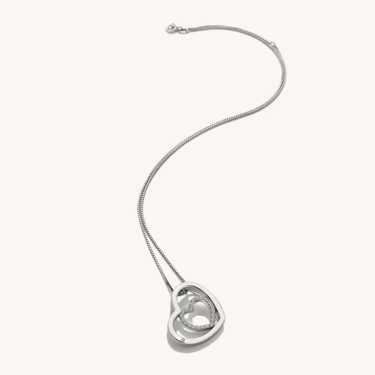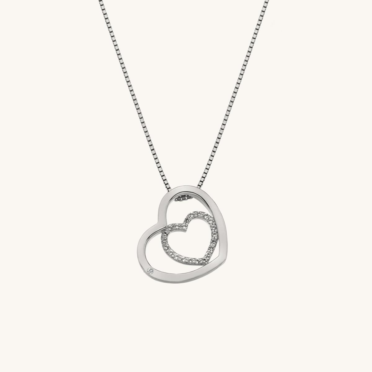 From our Most Loved Collection: Two hearts enchant one another with their individual beauty. This Enchanting pendant features two hearts one adorned with a real diamond and the other 22 beautiful white topaz stones. This pendant measures 20mm x 20mm and comes on a 40-45cm sterling silver chain.