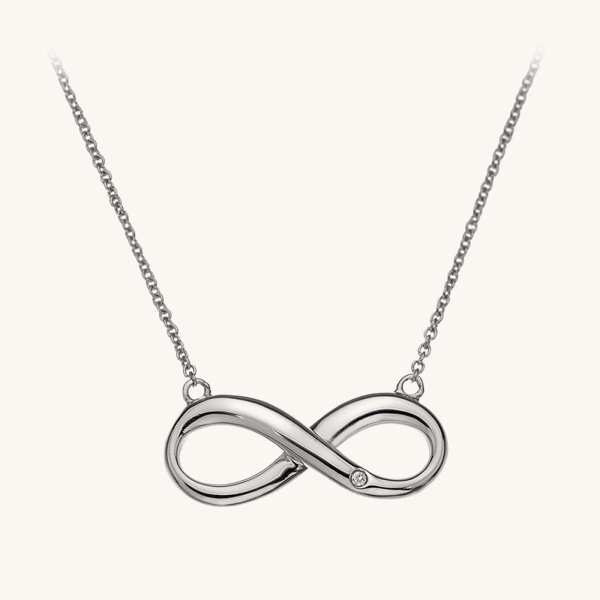 From our Forever Collection: The Fresh collection captures everlasting and eternal love. This infinity symbol pendant measuring 20mm across is adorned with a real one point diamond. A fixed 45cm trace chain is included with the pendant.