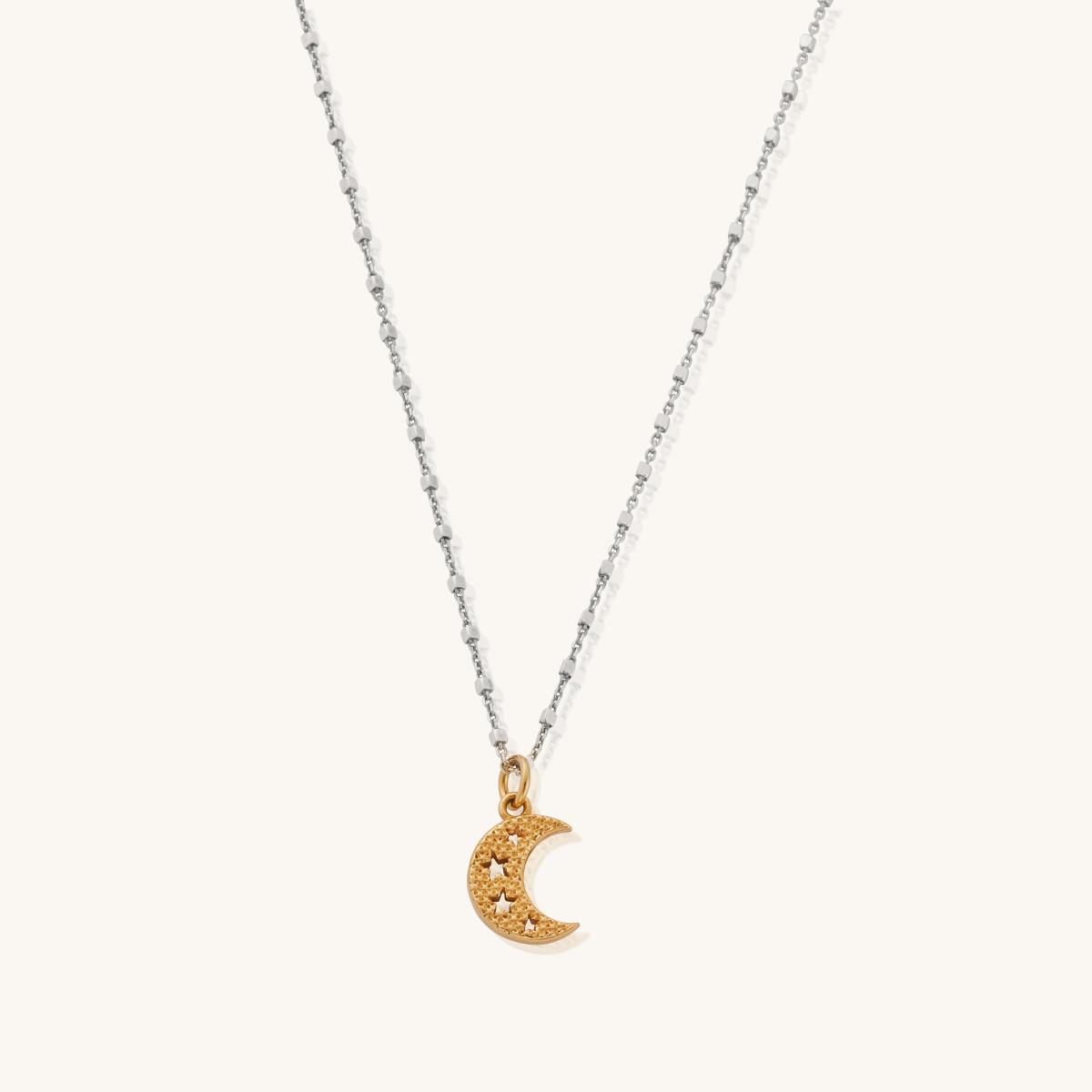 A silver cube chain catches the light beautifully, contrasted by a golden starry moon charm for a radiant mixed-metal finish. Symbolising hope, guidance, and intuition, this necklace serves as a gentle reminder to trust your journey and shine brightly through every phase of life.