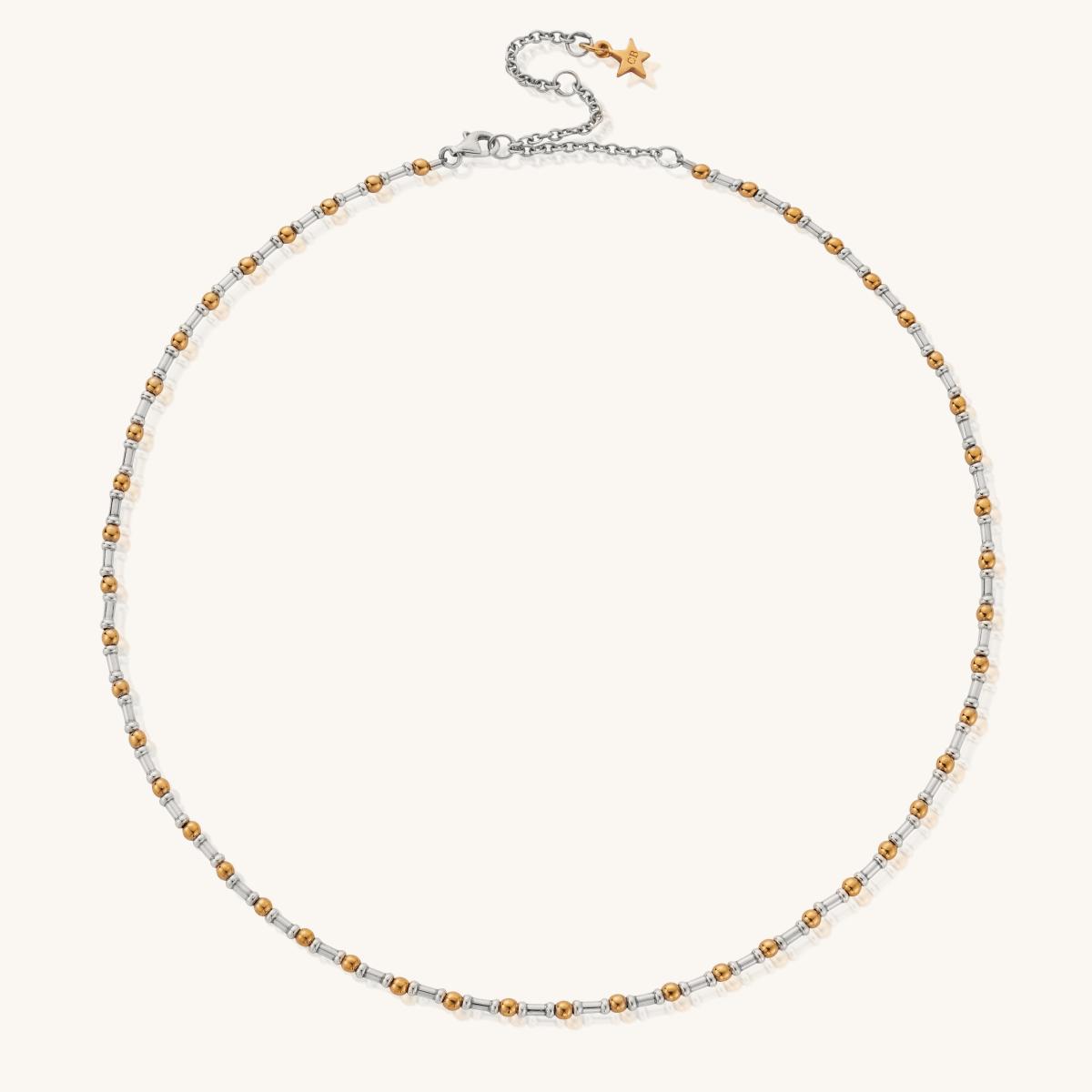 Gold and silver beads form a mixed-metal necklace inspired by the rhythm of water. Designed to represent flow and ease, it encourages letting go and moving through life gracefully, making it a versatile piece for subtle elegance.