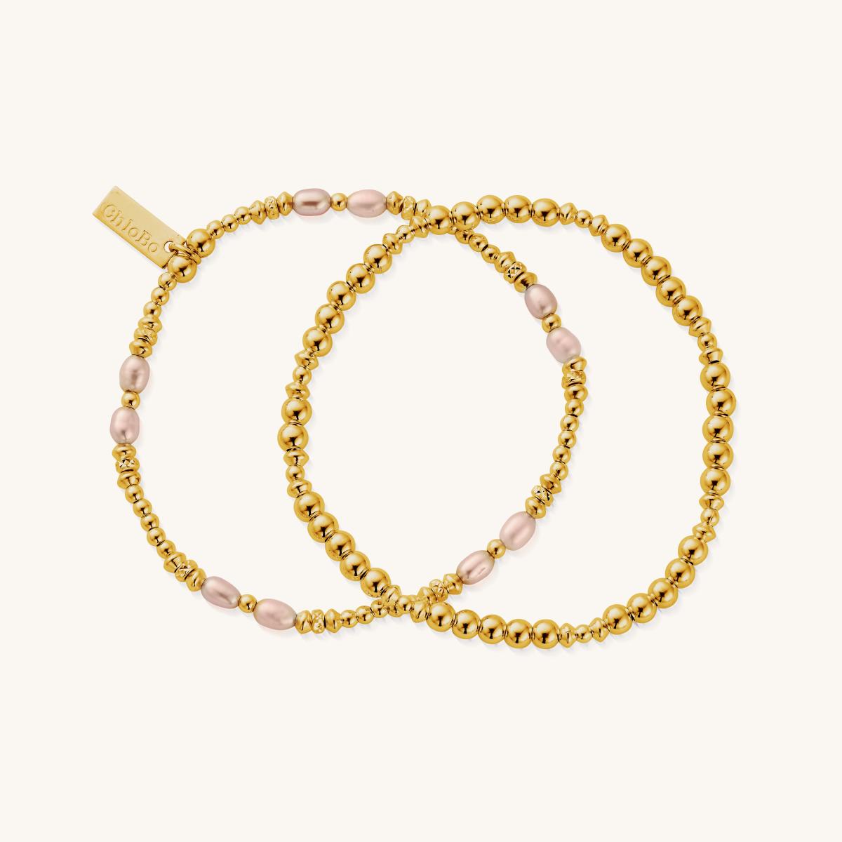 This delicate set of two pink pearl bracelets adds a soft glow to any stack. Symbolising love and compassion, the naturally unique baroque pearls bring timeless elegance and versatility, perfect worn together or styled separately for effortless everyday layering.