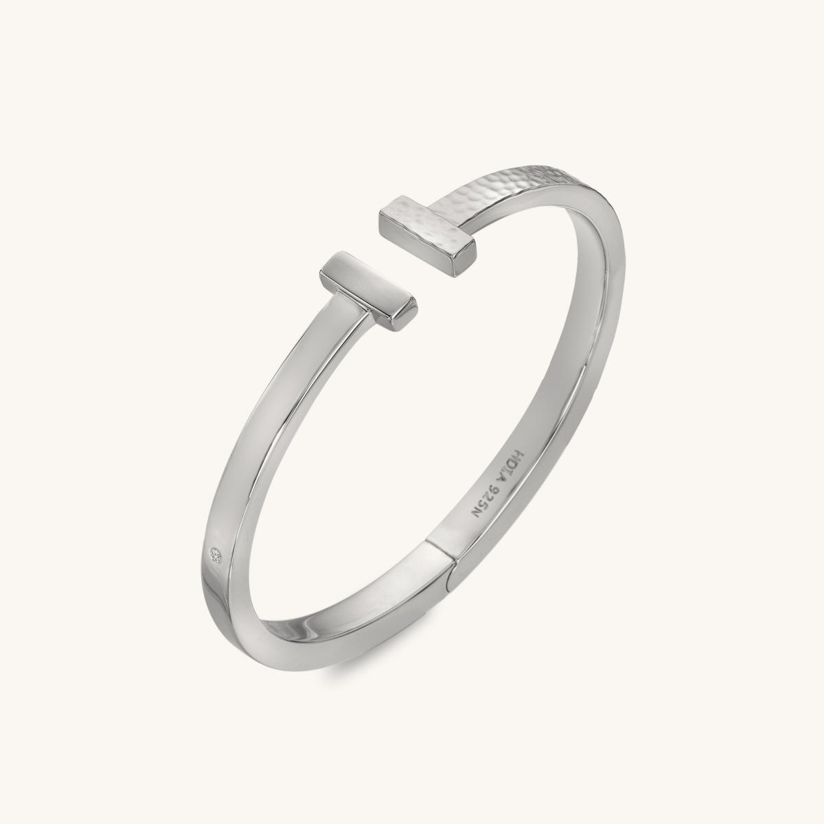 A T-bar bangle never misses, and this ones hammered detailing makes it the perfect jewel to add to your wrist stack! Crafted in sterling silver and hand-set with a real diamond, this bangle measures 12mm at it's widest point.