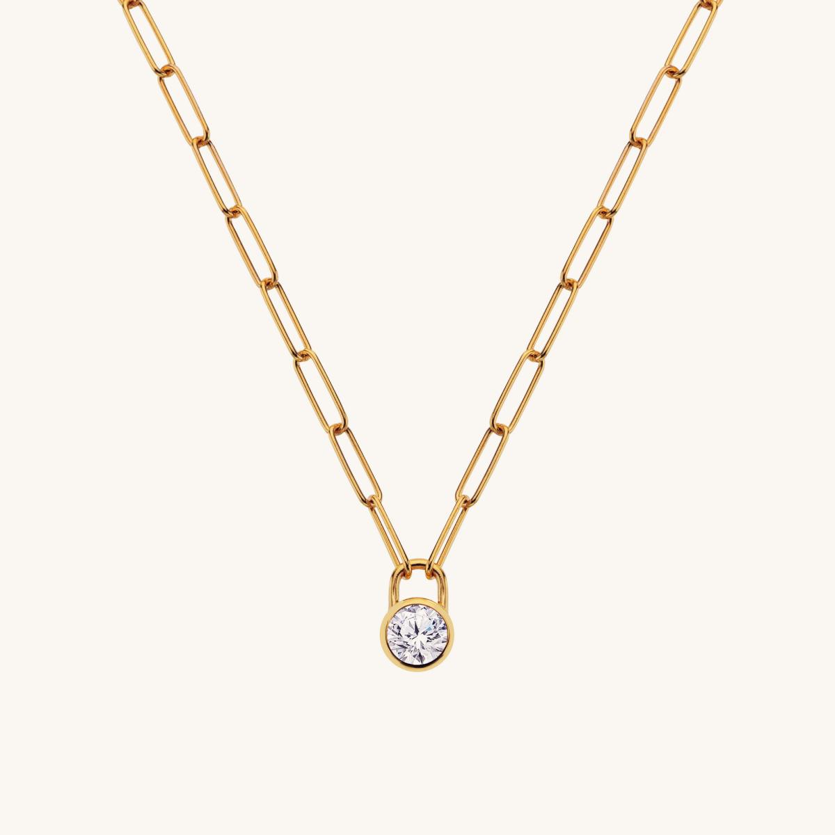 An new iconic jewel just landed. Meet Revolve, glowing in gold and featuring a mini padlock design with a White Topaz droplet, Revolve is an essential jewel in your box. Crafted in 18ct gold plate on sterling silver and hand-set with a real diamond, this necklace measures 45cm.