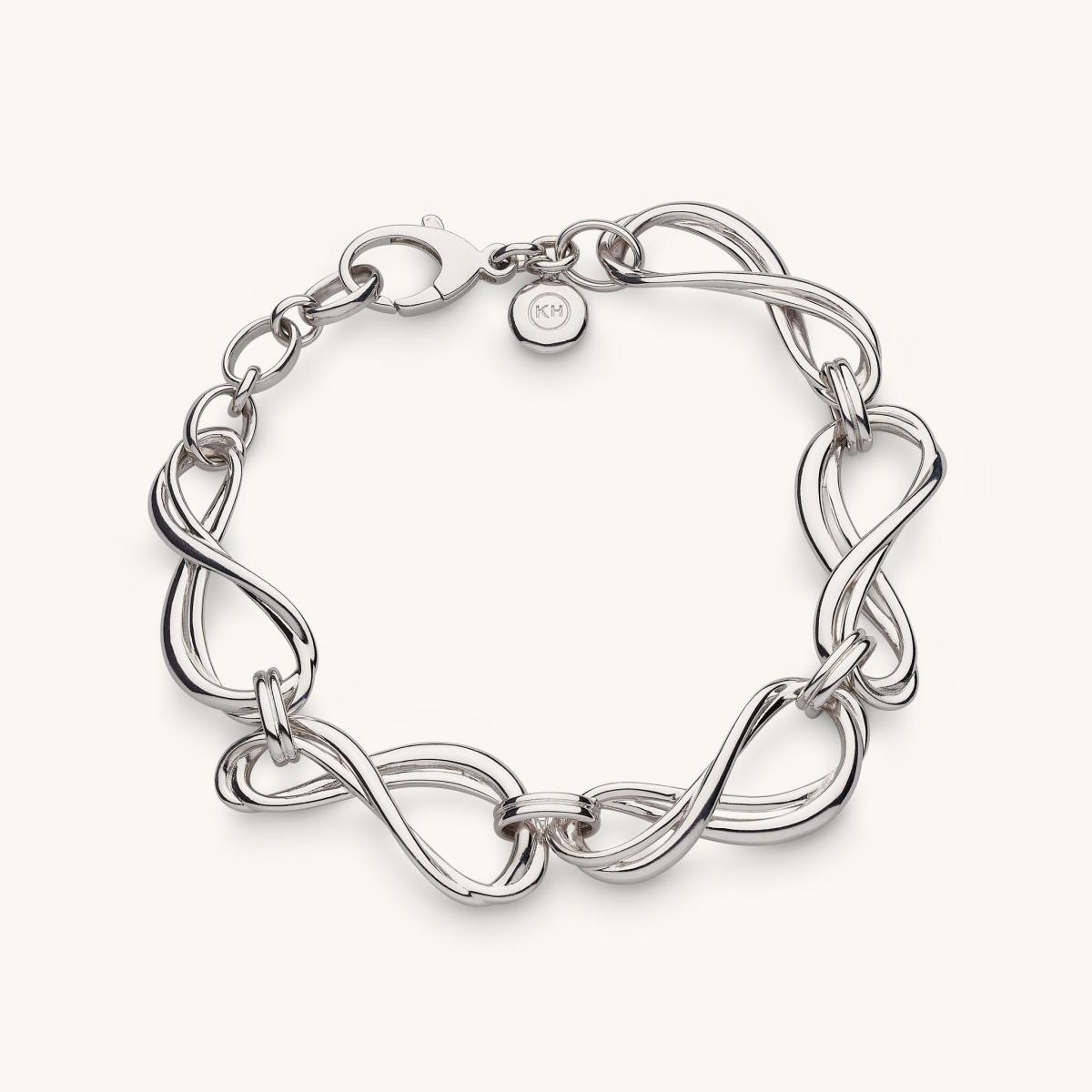 Rhodium plated sterling silver defines this bold infinity link bracelet. Each oversized link echoes the endless symbol, creating a statement profile with modern weight and presence. The rhodium finish adds lasting lustre, while the trigger clasp ensures secure wear. A refined piece with confident simplicity.