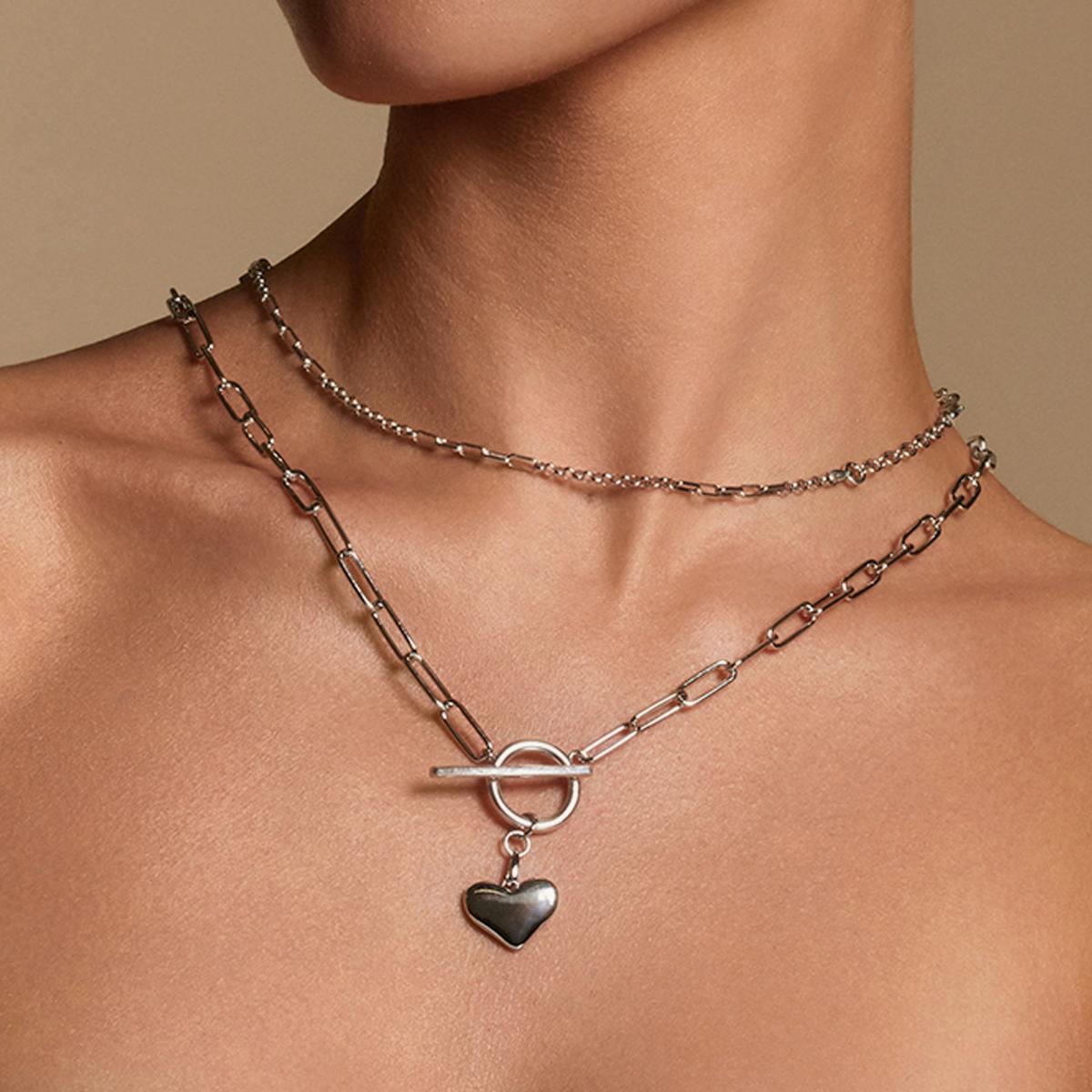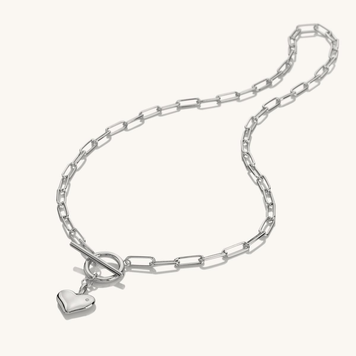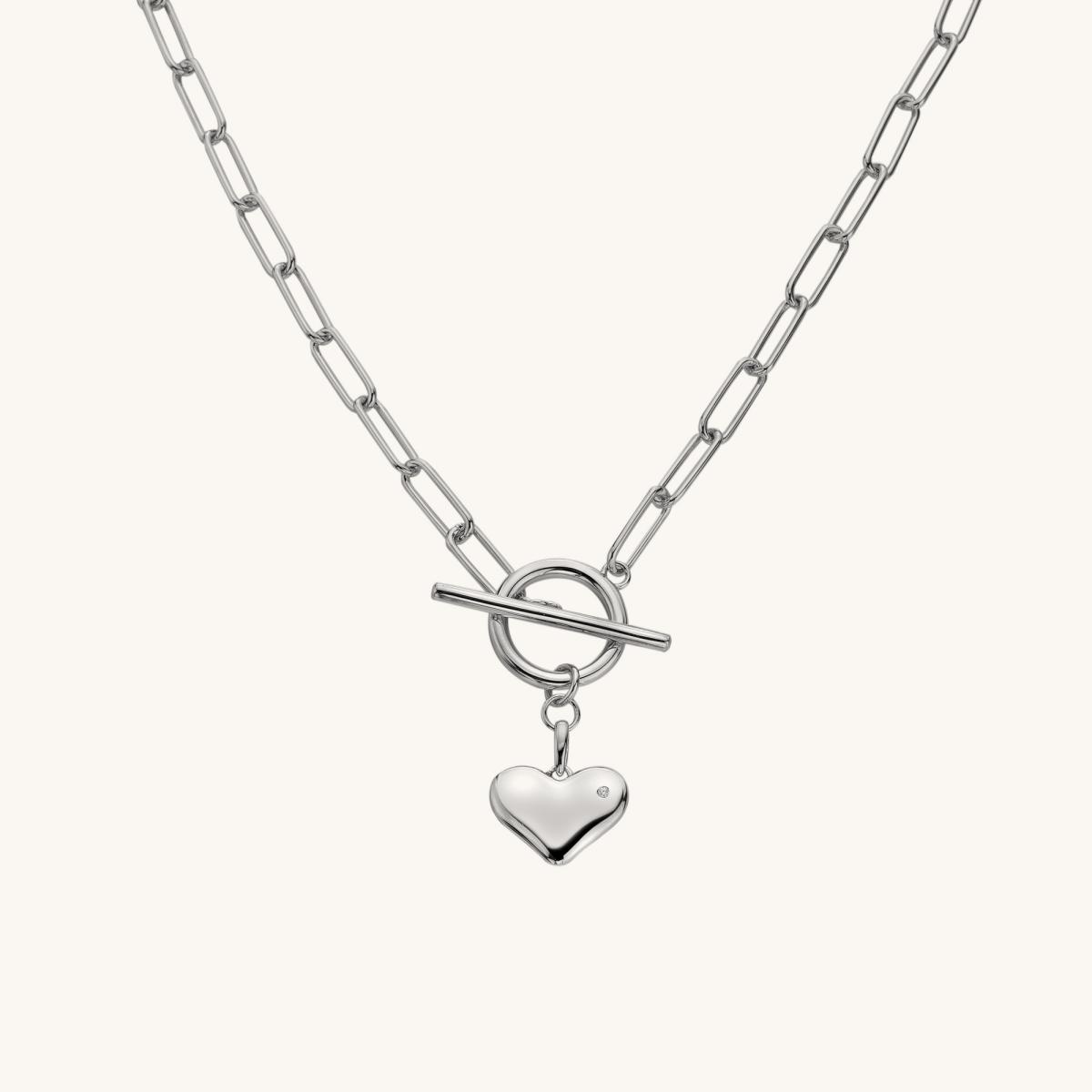 The classic T-bar necklace with a charming simple heart, it's a staple for your jewellery collection! Crafted in Sterling Silver and a hand-set diamond, the chain slides through the T-bar and is 60cm at its longest.