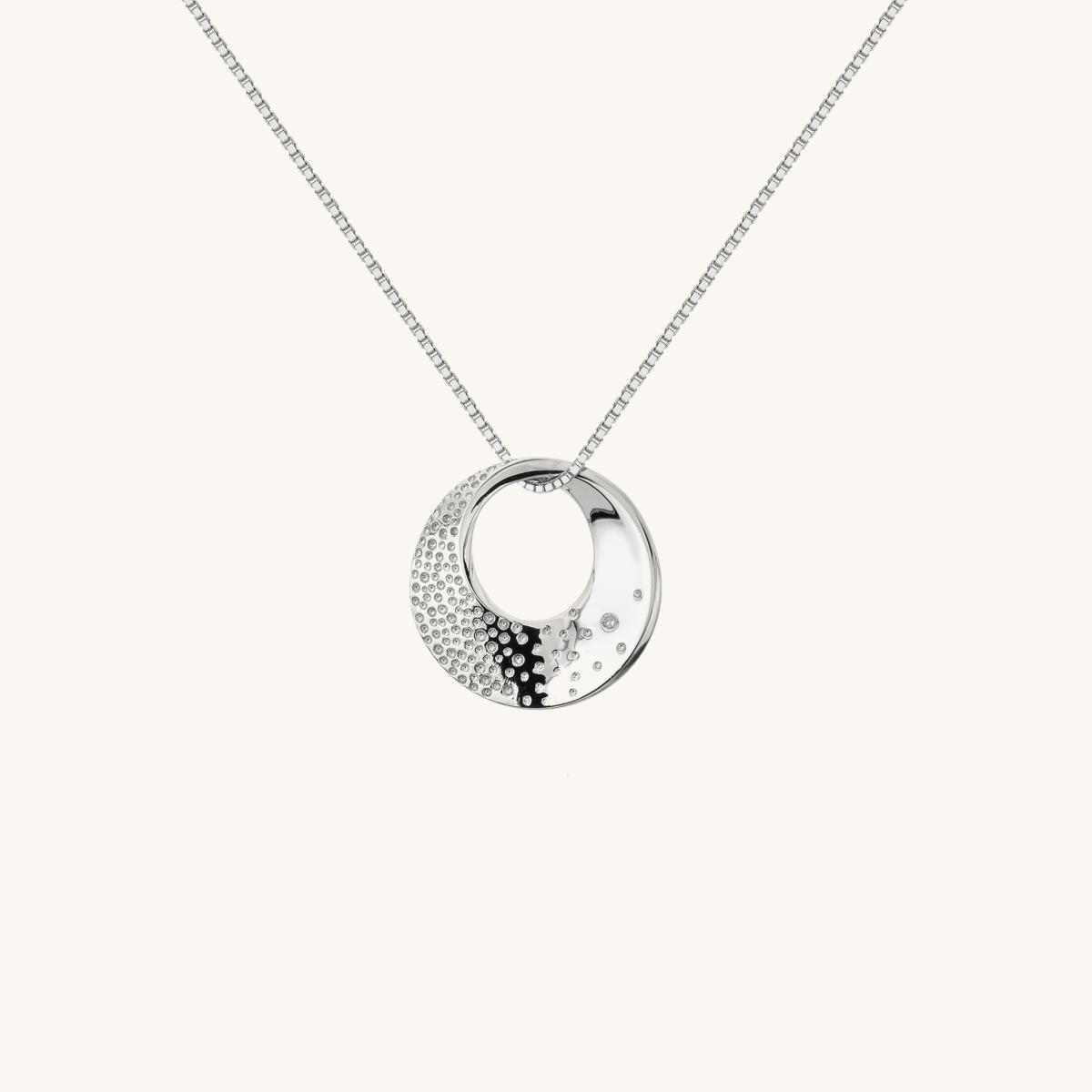 The Quest Circle Pendant is inspired by the undulations and textures we experience as we wander our way through the world. A long adventure full of twists and turns, rough and smooth. Crafted in 925 sterling silver, supplied on a sterling silver chain and adorned with a real diamond. The circle measures 22mm x 22mm.