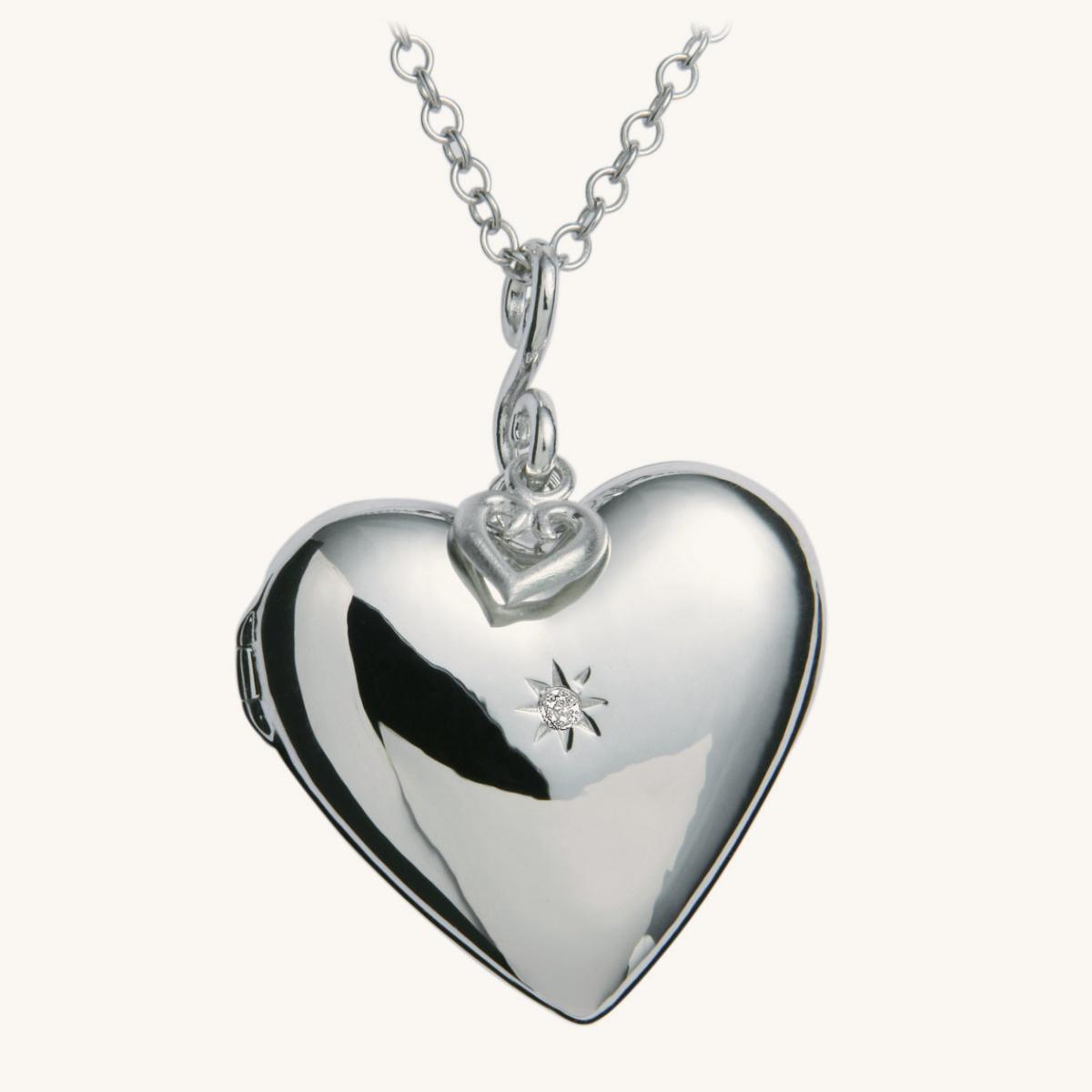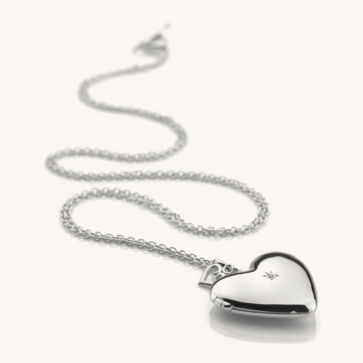 From our Memories Collection: Express your love with silver and diamonds! Crafted from 925 sterling silver this Confident Heart locket measures 35mm x 28mm and is adorned with a shimmering real 2 point diamond in the centre detail. Included with our 75cm belcher chain featuring a T bar clasp.