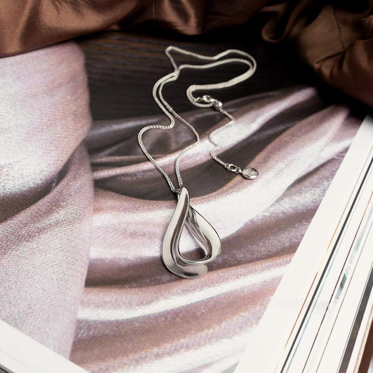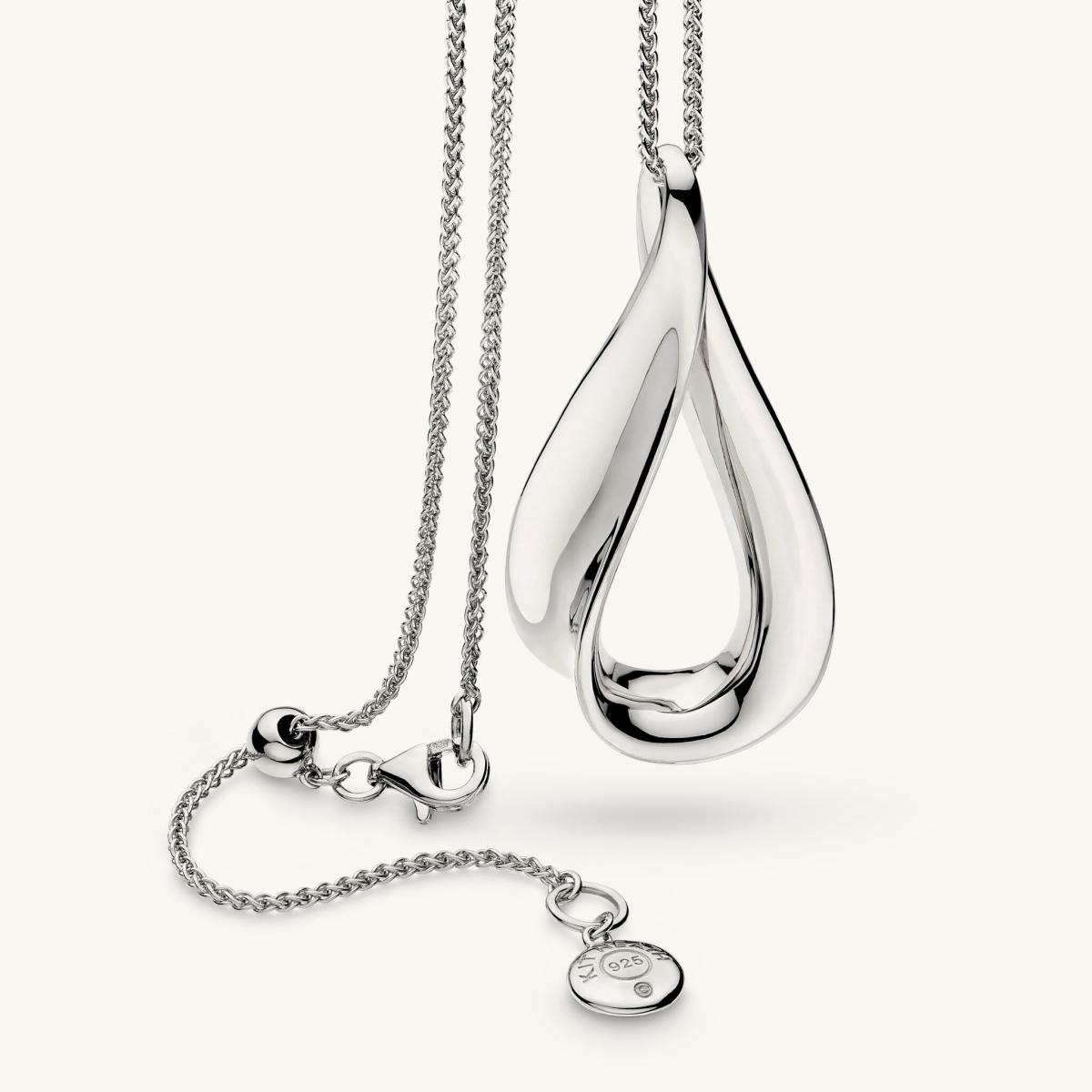 The Serenity Grande slider necklace showcases Kit Heath's signature design language through its bold, ribbon-like form. Crafted in rhodium-plated sterling silver, the pendant's generous looped silhouette creates fluid movement and visual balance. The adjustable slider clasp and extended chain offer versatility, making this a refined statement piece for day and evening wear.