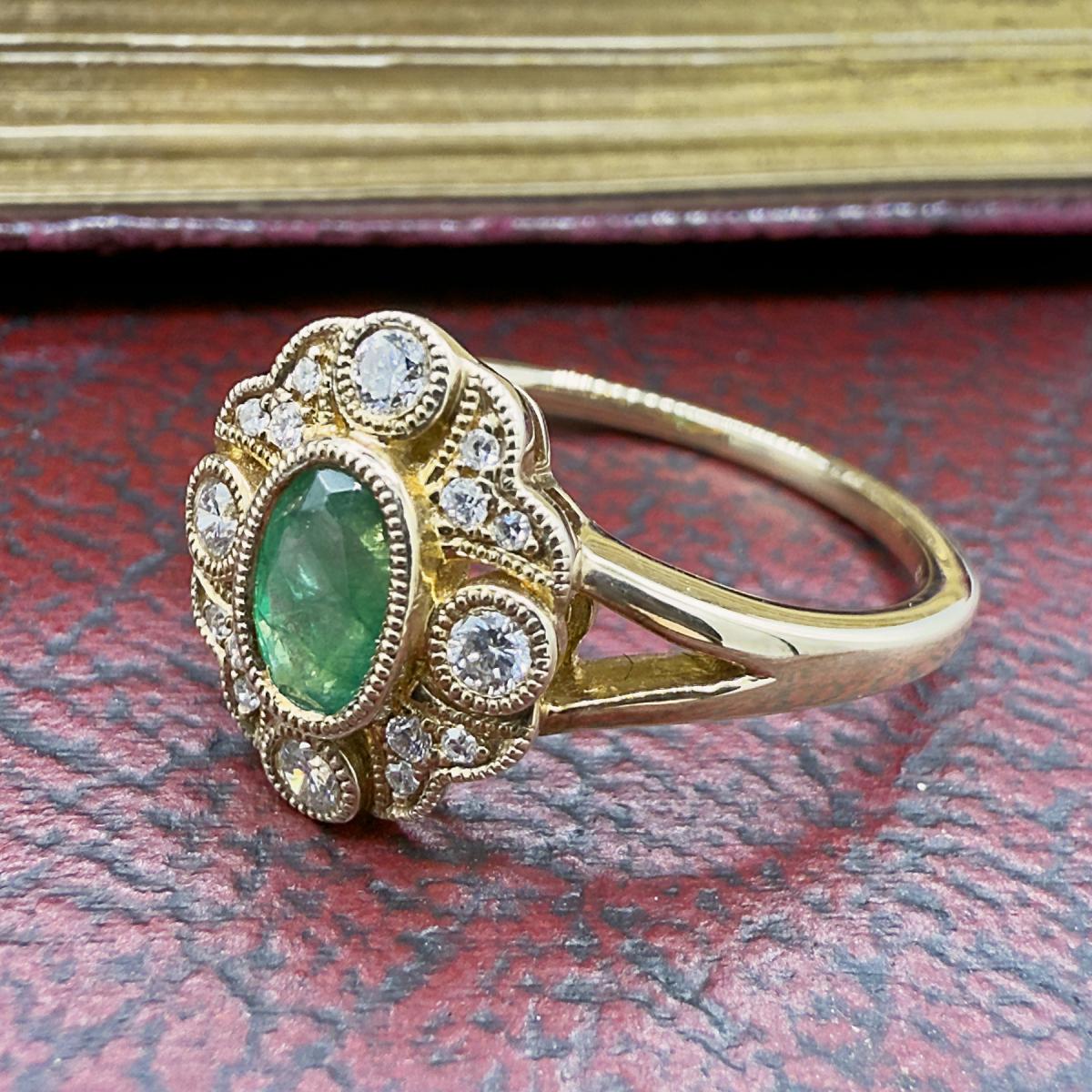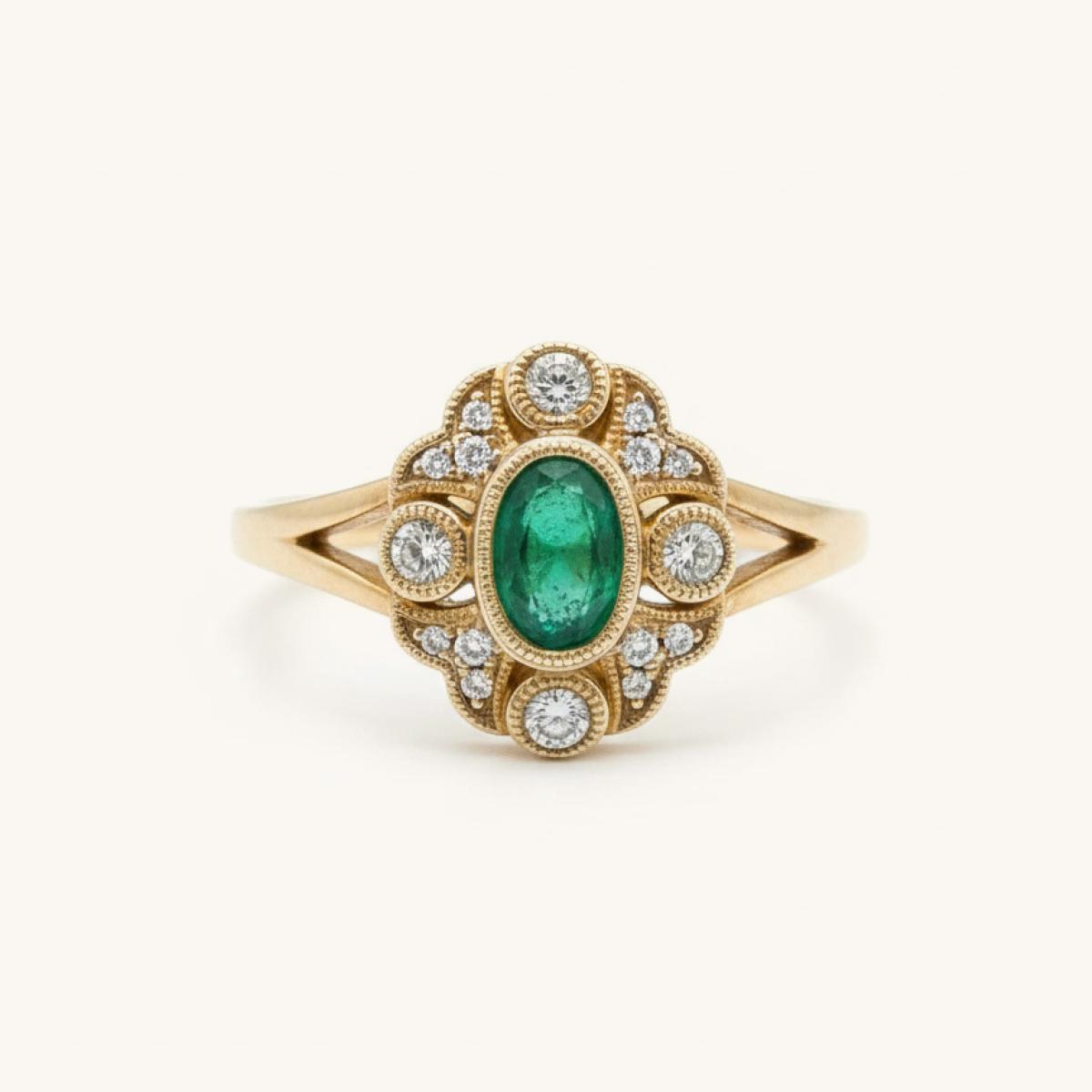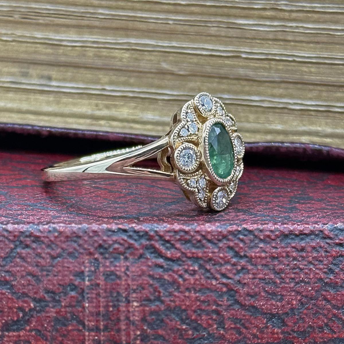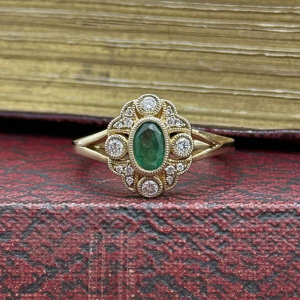 Vintage Style Emerald and Diamond Ring with Split Shoulders